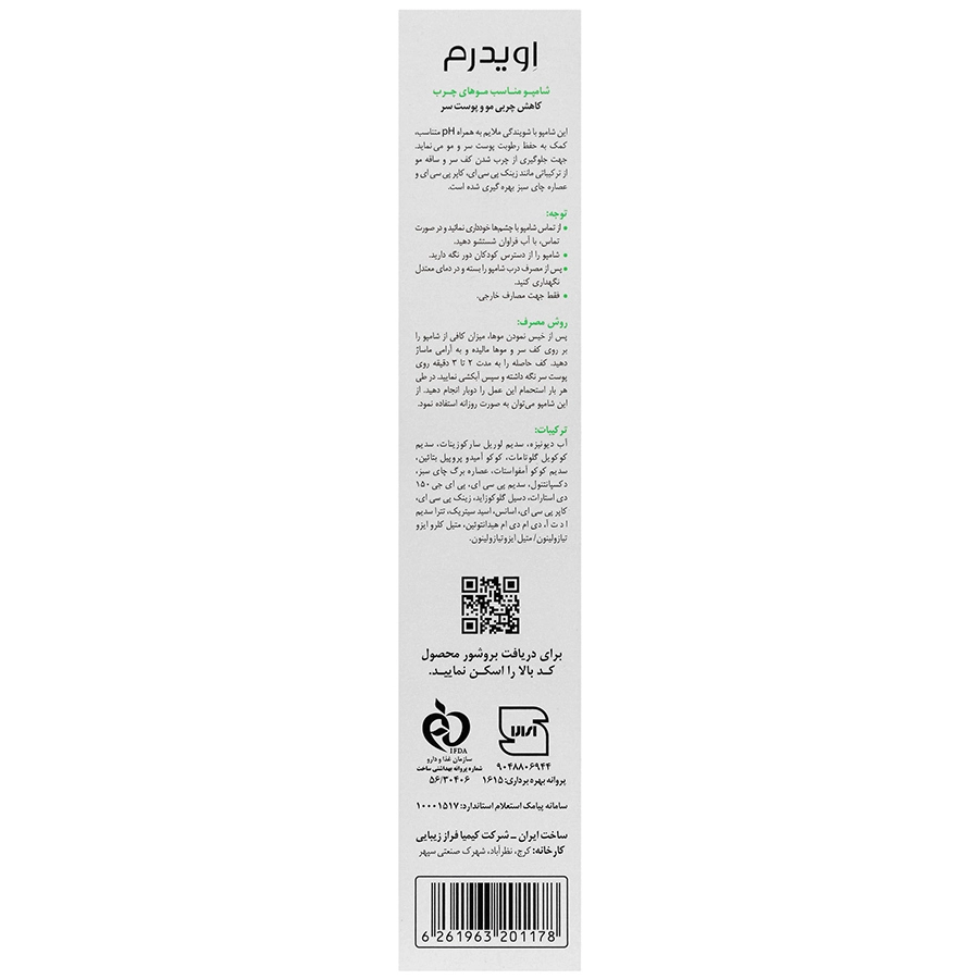 شامپو Sulfate-Free و فاقد سديم كلرايد اويدرم حاوى عصاره هاى گياهى، دكسپانتنول و گليسيرين مى باشد. در اين شامپو سورفكتانت هاى ملايم و در عين حال موثر جايگزين تركيبات سولفاته و آنيونى شده اند كه بسيار ملايم، مطمئن و مناسب موهاى كراتينه شده بوده؛ هيچ گونه آسیبى به موها وارد نمى كنند. اين محصول به ويژه براى افرادى كه موهاى كراتينه؛ آسيب ديده و يا حساس دارند و همچنين كسانی كه به استحمام روزانه عادت و نياز به شوينده هاى ملايم دارند، كاملا مناسب است.