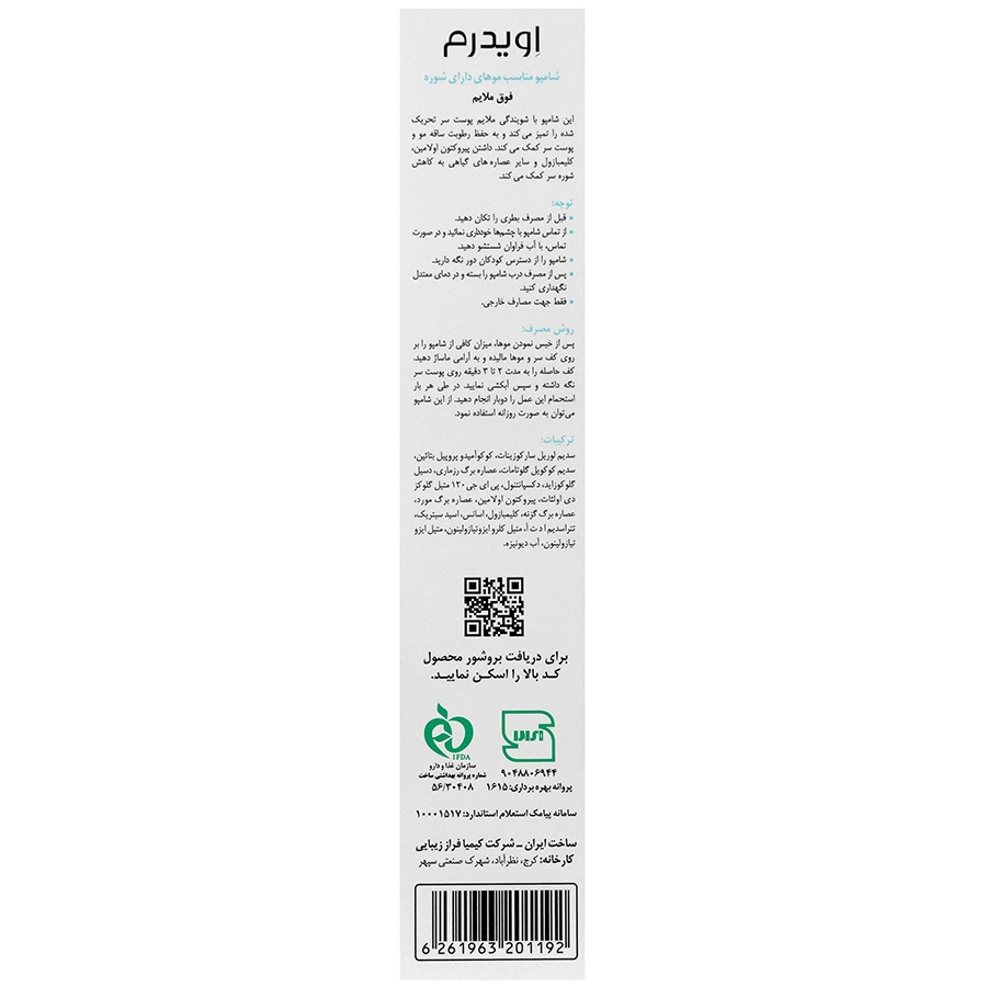 شامپو کمک به رفع شوره سر فاقد سولفات اویدرم، با شویندگی ملایم برای پوست سر تحریک پذیر، به حفظ رطوبت ساقه مو و پوست سر کمک می کند. همچنین با داشتن ترکیبات پیروکتون اولامین، زینک پریتیون و سایر عصاره های گیاهی کمک به رفع شوره سنگین سر می نماید.