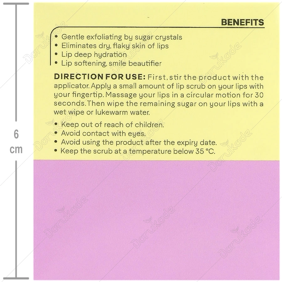 مقدار کمی از اسکراب لب را با نوک انگشت روی لب های خود بمالید. به مدت 30 ثانیه لبهای خود را بصورت دورانی ماساژ دهید. سپس شکر باقی مانده بر روی لب را با یک دستمال مرطوب یا به کمک آب ولرم پاک کنید.