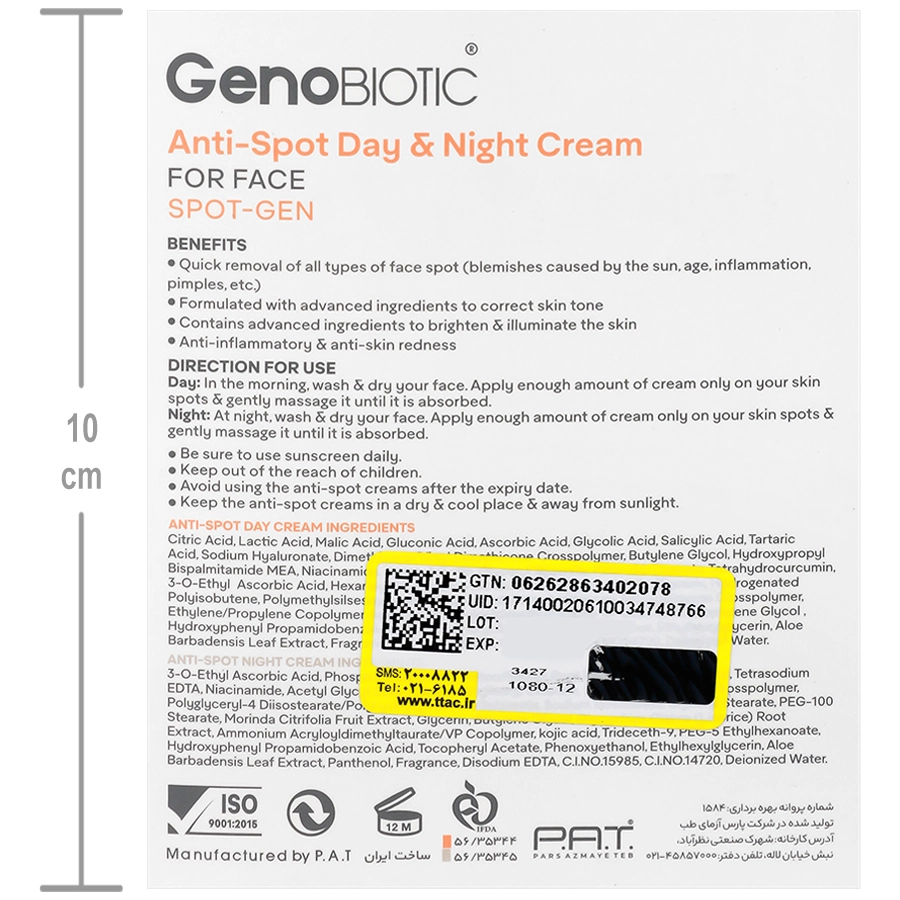 محصول ضد لک ژنوبایوتیک، به صورت دو کرم تخصصی روز و شب طراحی شده است که مکمل یکدیگر بوده و برای درمان انواع لک، موثر هستند. آربوتین و کوجیک اسید موجود در این کرم از فعالیت آنزیم تیروزیناز و تولید ملانین در پوست جلوگیری کرده و پوست را عاری از لک می کند. انواع لایه بردار ها با قدرت ملایم تا قوی در این محصولات استفاده شده است تا ناحیه لک را از سلول های مرده و لک به جا مانده بر روی پوست، پاکسازی کنند.