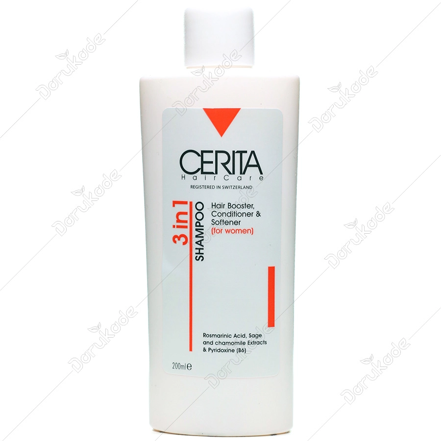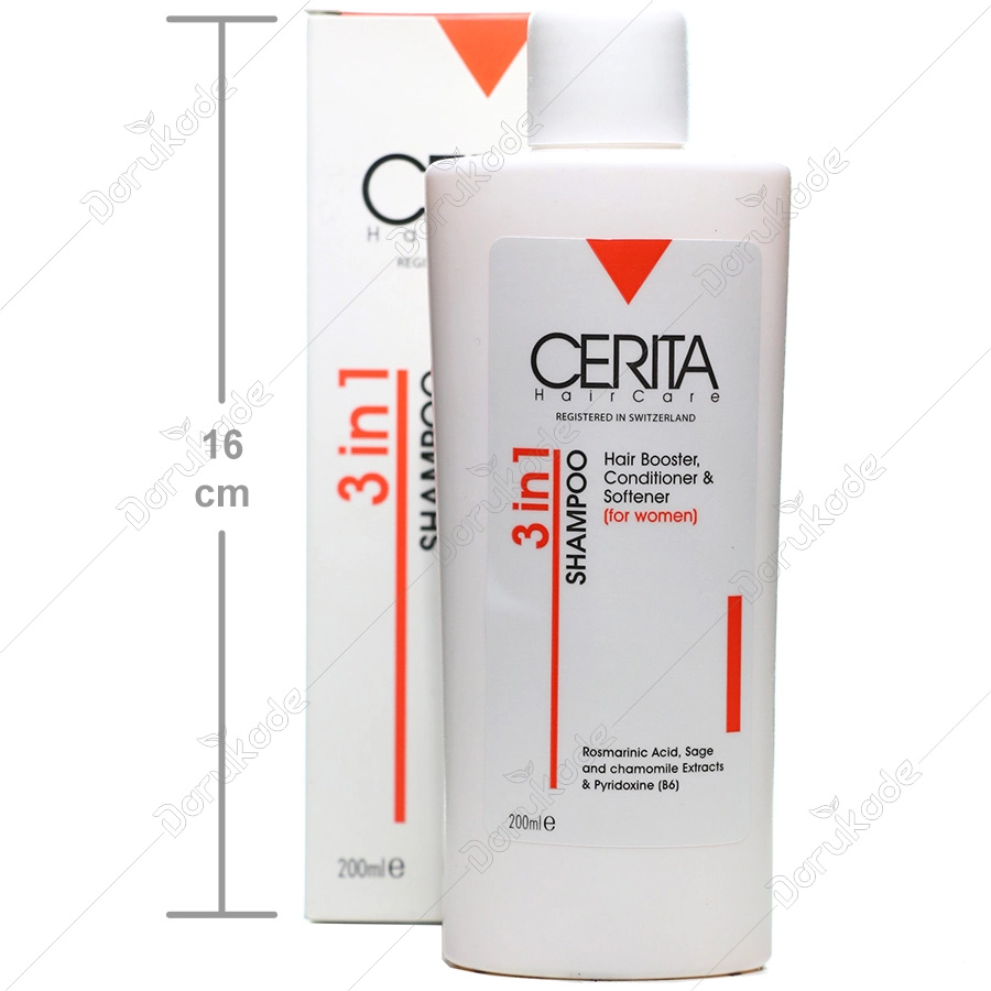 شامپو 3 در 1 نرم کننده، حالت دهنده و تقویت کننده سریتا دارای ترکیب ویژه ای حاوی عصاره های طبیعی گیاهی، ویتامین ها و عوامل آنتی اکسیدان طبیعی، پلی مرکاتیونیک (عامل حالت دهنده و نرم کننده موی سر) و عوامل دایمتیکونی ( حالت دهنده و درخشان کننده مو) است که در مجموع موجب حالت پذیری بهتر ایجاد نرمی بیشتر در تار مو و تقویت تار مو و کف سر می گردد. این فرمولاسیون ویژه که سرشار از عصاره های گیاهی بابونه، مریم گلی، نعناع فلفلی، ویتامین ب5 و ب6 و دکسپانتنول می باشد باعث استحکام ریشه مو و سلامت، زیبایی و درخشندگی تار مو می گردد. این شامپو به صورت روزانه و برای موهای خشک و معمولی توصیه می گردد.