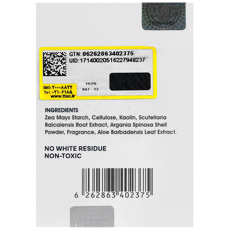 حاوی کائولین، عصاره گیاه بشقابی، پودر پسته آرگان، عصاره برگ آلوئه ورا، نشاسته ذرت و سلولز