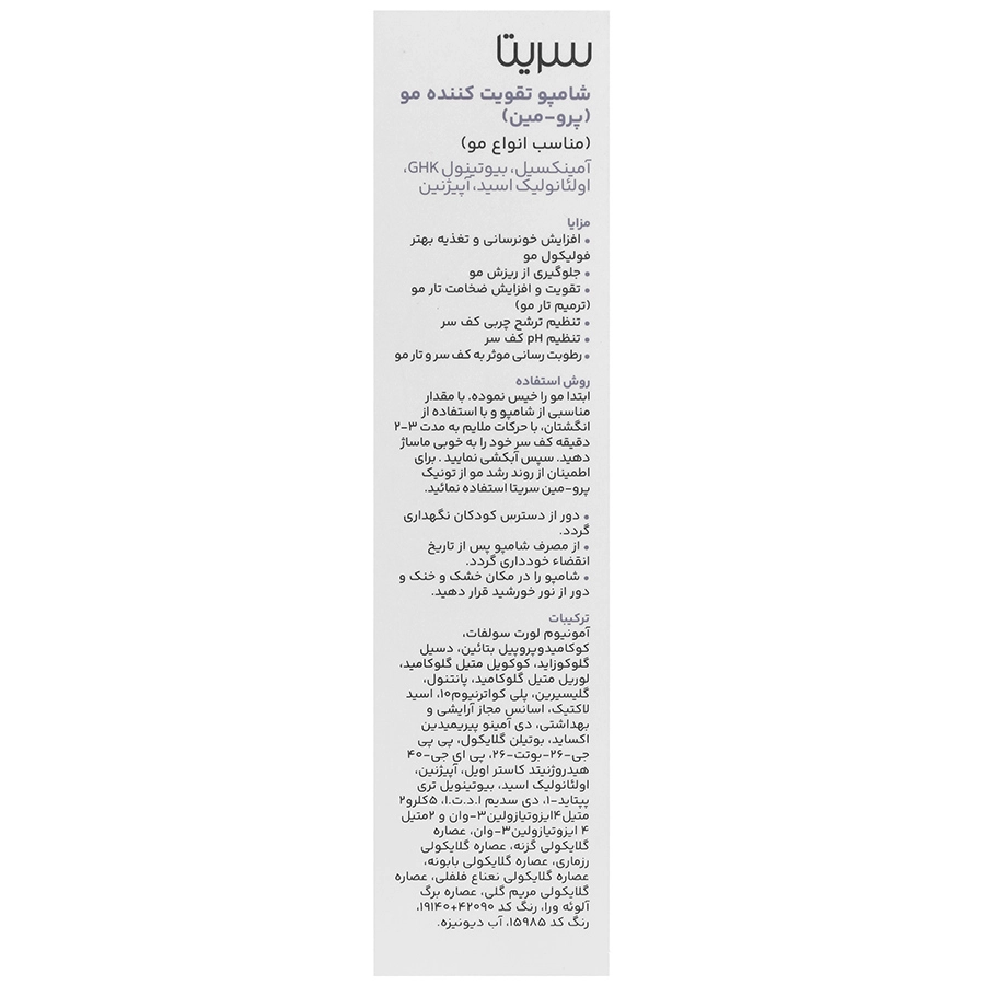 شامپو پرو مين سريتا، فرمولاسيونى كارآمد براى تحريک رشد و تقويت فوليكول هاى مو است. اين شامپو با مهار عوامل ريزش، نقش مهمى در پيشگيرى از ريزش مو دارد، علاوه بر اين با تقويت فوليكول هاى مو باعث رويش مجدد تارهاى مو مى شود.