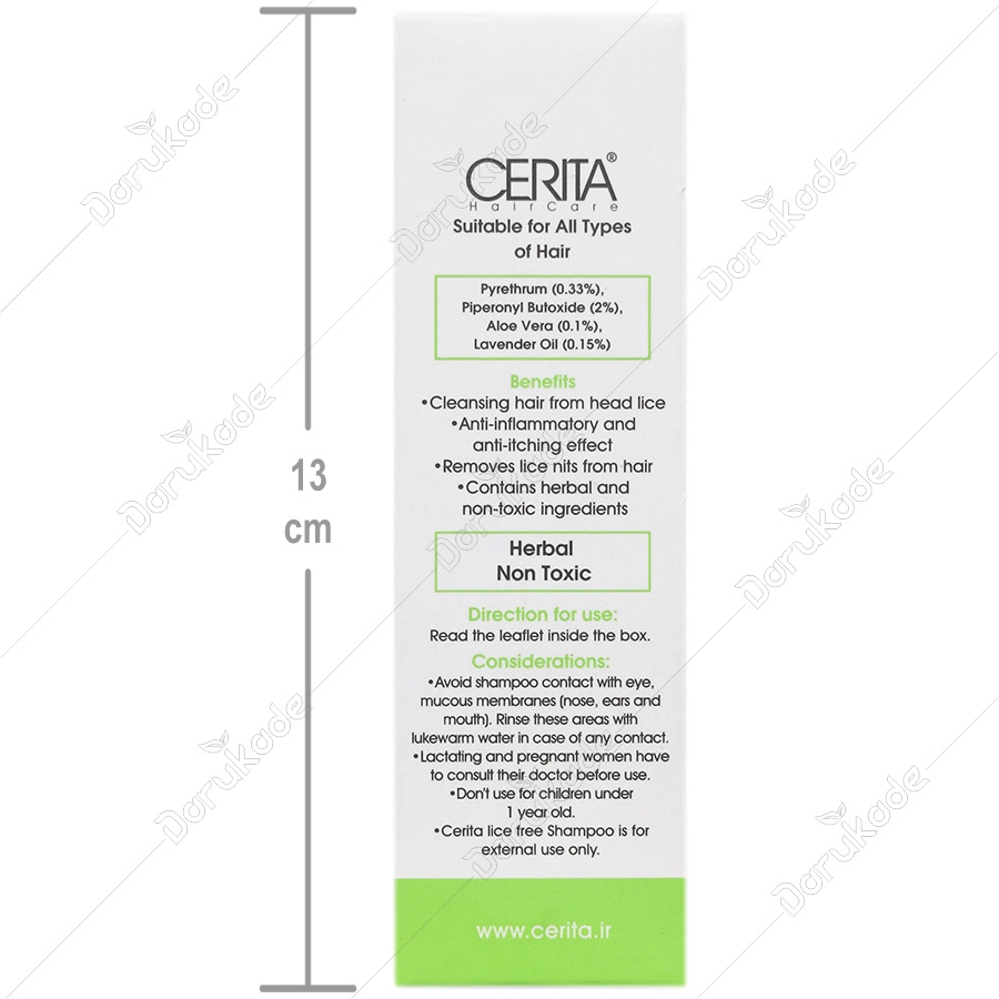 از تماس با چشم، داخل بینی، گوش و دهان خودداری کنید. در صورت تماس سریعا این نواحی را با آب بشوئید. زنان شیرده و حامله، قبل از استفاده از شامپو با پزشک خود مشورت کنند. از این شامپو برای کودکان زیر یکسال استفاده نکنید. شامپو لایس فری سریتا تنها به منظور استعمال خارجی است.