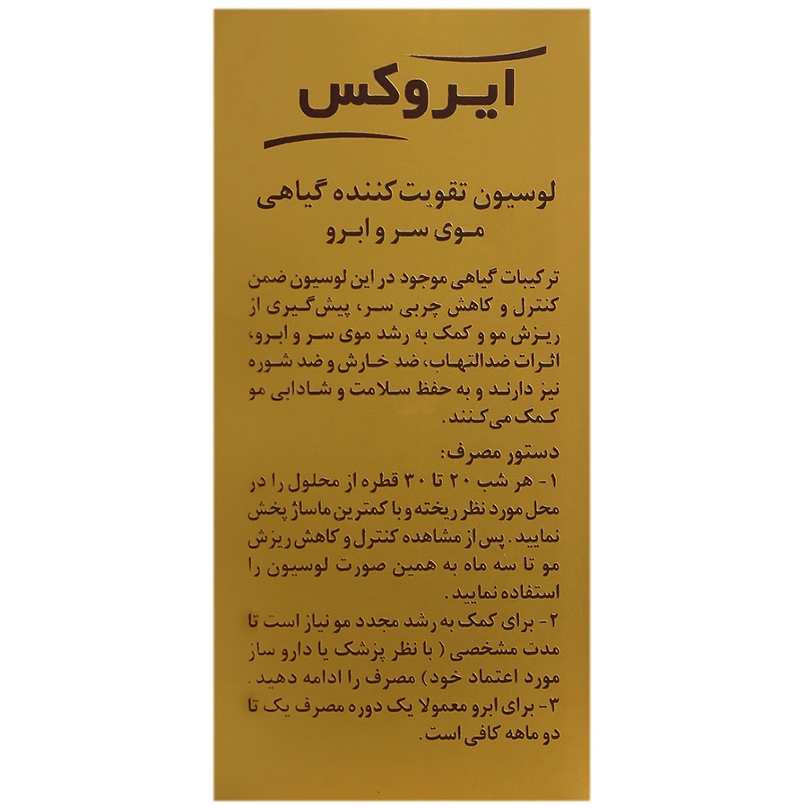لوسیون تقویت موی سر و ابرو ایروکس با بهبود گردش خون محیطی در اسکالپ و تغذیه بهتر فولیکول مو، به رشد مو کمک شایانی می کند. همچنین با وجود ترکیبات گیاهی که ساختار نزدیکی به استروژن ها دارند از ریزش مو آندروژنتیک نیز جلوگیری می کند و با داشتن اثر ضد شوره و ضد خارش و همچنین ضد التهاب و التیام بخش در بهبود کارایی درمان های ضد شوره و کاهش چربی اسکالپ و رفع خارش و التهابات اسکالپ نقش مهمی ایفا می کند.